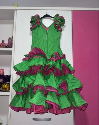 Vestido de flamenca con un diseño vibrante y volantes. - Tejido principal verde con pequeños topos fucsia . - Volantes en cascada en color rosa fucsia. - Mangas abullonadas con volantes. - Ideal para ferias y eventos flamencos.