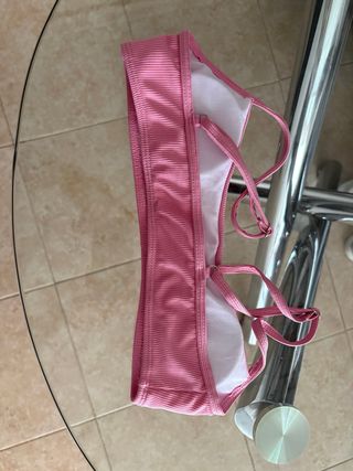Top de bikini de color rosa con un diseño texturizado. - Tejido acanalado. - Tirantes finos cruzados en la espalda.