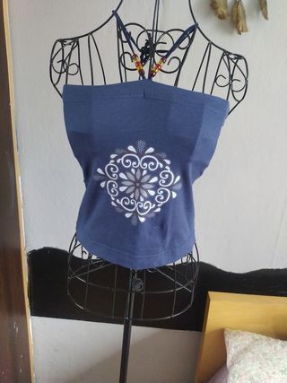 Precioso top blanco con un diseño elegante y detalles brillantes. - Tejido ligero y con textura. - Adornos metálicos dorados. - Tirantes al cuello. Talla única S/M ya que la espalda va con goma y es bastante flexible incluso para una talla L si no tiene mucho pecho tambien sirve. Muy fresquito y bonito para llevar en verano