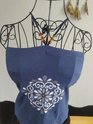 Bonito top sin mangas con un llamativo bordado en la zona del pecho. - Diseño con escote redondo. - Detalle de bordado geométrico en tonos naranja y blanco. - Corte holgado y ligero. Es la talla M pero el tallaje es pequeño Tags ropa mujer camisa jersey chaqueta top rebeca americana sudadera pantalón pantalones vaqueros vaquera niki chaquetón