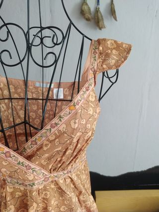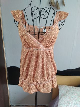 Precioso top de seda con un delicado estampado floral. Es ligero y tiene un diseño muy femenino. - Tirantes finos. - Cierre de botones en la parte delantera. - Detalle de volante en el bajo con cordón ajustable.