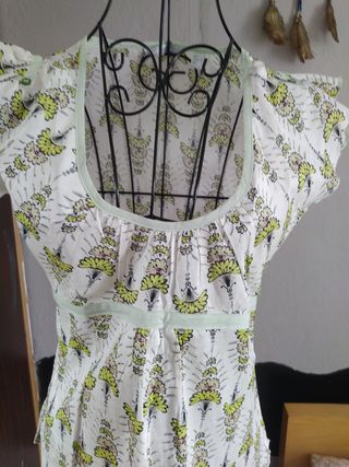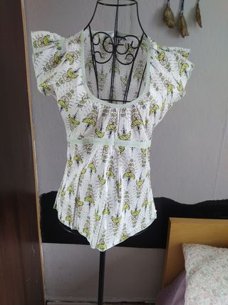 Precioso top de algodón con un delicado estampado floral en tonos verdes y amarillos. El diseño presenta un escote cuadrado y mangas cortas con un ligero vuelo. - Material: 100% Algodón. - Estampado: Flores y motivos botánicos. - Diseño: Escote cuadrado, mangas cortas con vuelo.