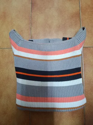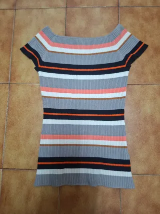 Top de punto con un diseño de rayas multicolor. Tiene un escote Bardot. - Diseño de rayas horizontales. - Escote Bardot. - Manga corta.
