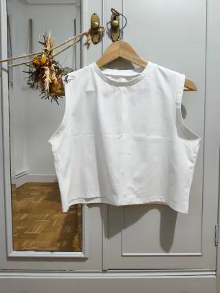 Top blanco corto y ancho ideal, sin mangas. Cuello redondo.
