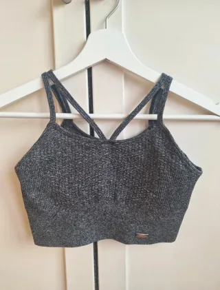 Top deportivo de tejido jaspeado, perfecto para actividades como yoga o entrenamiento. - Diseño con tirantes cruzados en la espalda. - Tejido elástico y cómodo.