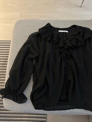 Elegante top negro de Zara, perfecto para ocasiones especiales. Su diseño con tirantes finos y falda plisada le da un toque sofisticado. Cremallera rota. - Cuerpo fruncido. - Volantes con doble capa plisada. - Tirantes finos. Ideal para fiesta, sienta muy bien. Está sin estrenar (lleva la cuerdita de la etiqueta), pero a pesar de ello, tiene la cremallera lateral rota (sacada del rail). Ver ultima foto. Sólo envíos. #blusa #top #fiesta #topfiesta #blusafiesta #ropadefiesta