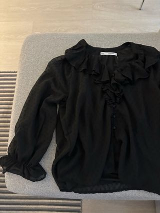 Elegante blusa negra de Sfera con un diseño de volantes. - Tejido con pequeños topos. - Mangas largas abullonadas con puño. - Cierre de botones. - Cuello con volantes.