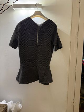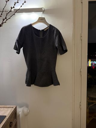 Top de la marca Sandro con un diseño texturizado en gris y negro. Presenta un corte peplum. - Cremallera trasera. - Manga corta.