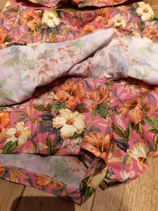 Top de gasa con estampado de lavanda y atardecer. Con forro (ultima foto), no transparenta Estampado de campo de lavanda Sin usar, con etiqueta Precio original 39€