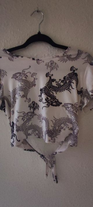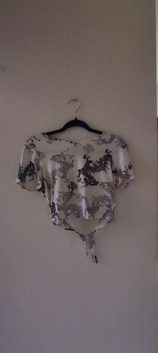 Precioso top corto de color blanco con estampado de dragones. Es una prenda delicada y elegante, ideal para cualquier ocasión. - Diseño de cuello redondo. - Manga corta. - Detalle de lazo en la parte trasera.