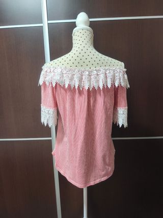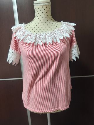 Precioso top con un diseño de rayas verticales en blanco y rojo. Presenta un detalle de encaje blanco en el escote y en las mangas. - Escote Bardot con volantes de encaje. - Mangas cortas con puños de encaje. - Tejido ligero y cómodo.