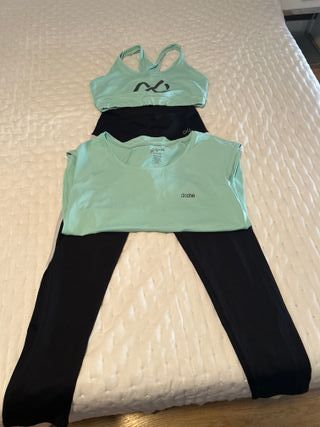 Conjunto deportivo de tres piezas. - Top deportivo. - Pantalón largo.