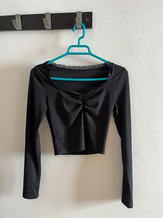 Top corto de manga larga con tejido acanalado. - Diseño cropped. - Cuello redondo. - Manga larga.