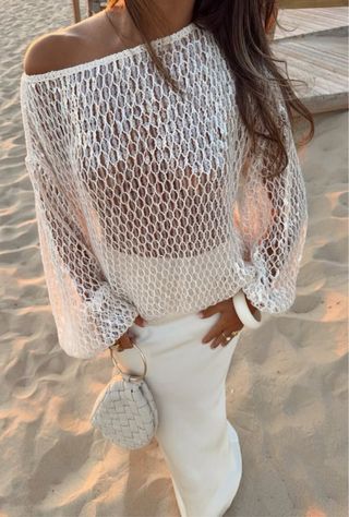 Precioso top de Stradivarius con un diseño calado muy original. Es una prenda ligera y moderna, perfecta para añadir un toque especial a tus outfits. - Diseño de punto calado. - Manga larga. - Corte cropped.