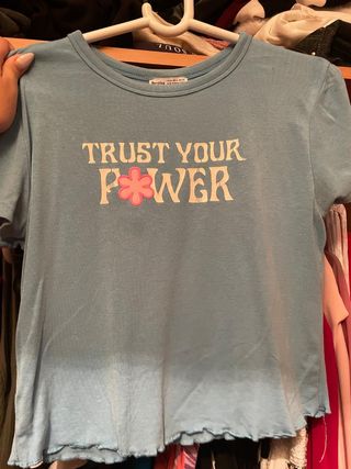 Top corto de Bershka con un diseño llamativo. - Estampado TRUST YOUR POWER con una flor. - Manga corta. - Bajo con acabado festoneado.