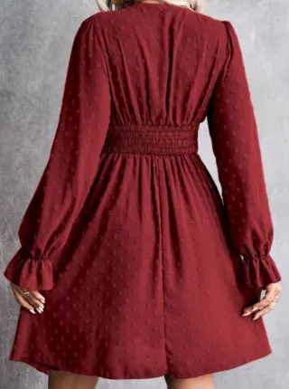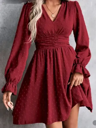 Vestido elegante de manga larga con un diseño con costuras de topos sutil. - Escote en V. - Cintura fruncida. - Mangas abullonadas con volantes en los puños. - Falda con vuelo.