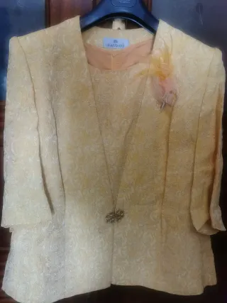 Elegante traje de chaqueta de tres piezas para señora. - Chaqueta y top de tejido brocado. - Broche decorativo en la solapa. - Adorno floral en la solapa.