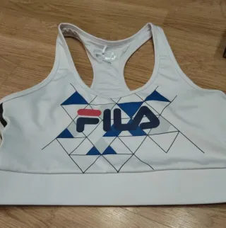 Top deportivo de la marca Fila en color blanco, con un diseño geométrico de triángulos en azul y rojo. - Diseño de tirantes. - Banda inferior ancha. Está como nuevo