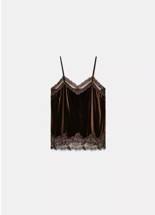 Elegante top de tirantes finos con un acabado brillante y suave. Agotado en tienda. - Detalle de encaje en escote y bajo. - Tejido de terciopelo.