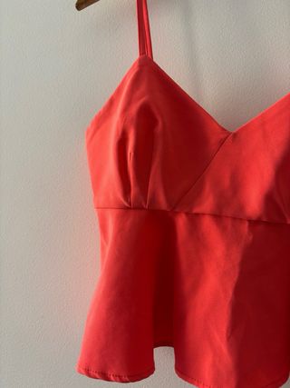Top corto de tirantes finos, ideal para eventos o fiestas. Presenta un diseño con escote en pico y un volante en la parte inferior. - Color fucsia vibrante. - Tirantes finos ajustables. - Escote en pico. - Corte peplum con volante.