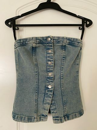 Top vaquero sin tirantes con botones frontales. - Diseño ajustado. - Costuras marcadas.