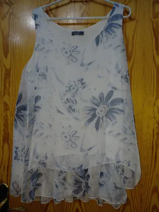 Top de capas con un bonito estampado floral en tonos azules y blancos. Talla XL, medidas de sisa a sisa 54, largo 74, tejido fluido. Es una prenda ligera y fluida, perfecta para añadir un toque de estilo. - Diseño de capas. - Estampado floral. - Tejido ligero y vaporoso.