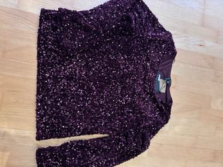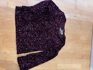 Top de lentejuelas con un vibrante color burdeos. Ideal para eventos o para añadir un toque festivo a tu atuendo. - Diseño de manga larga. - Acabado brillante y llamativo.