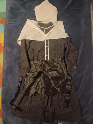 Conjunto tradicional de baserrita casera talla 8. - Vestido con estampado de topos. - Delantal negro satinado. - Pañuelo blanco. - Cofia blanca.