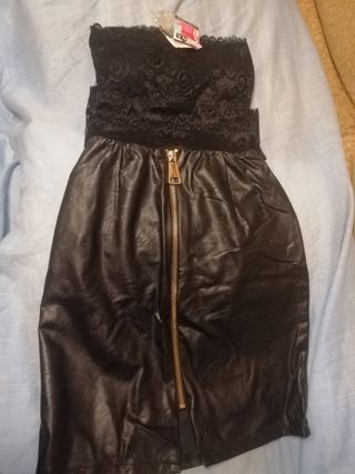 Falda de Polipiel con cintura elastica y Top de Encaje con almohadillas interiores que se pueden quitar. Top talla S/M, falda talla 34/36