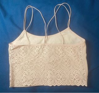 bralette de encaje en color blanco con refuerzo de copas de sujetador es completamente elástico y tiene tirantes ajustables cruzados en la espalda marca talla XL pero es talla L