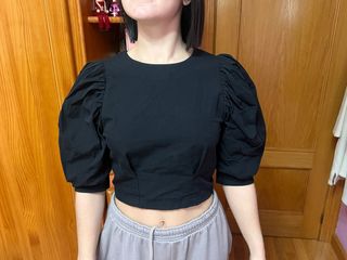 Top negro con mangas abullonadas. - Diseño corto. - Mangas con volumen. - Cuello redondo.