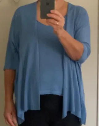 Conjunto de top y chaqueta de punto fino para el verano, azul celeste. Talla 40-42. Buen estado. Top de tirantes. Ancho bajo la axila 40cm, Ancho parte inferior 47cm, Largo 53cm. Chaqueta con manga japonesa, mucha caída. Largo de manga a manga 94cm. Ancho bajo la axila 62cm, Largo 67cm. En las fotos de las medidas el color ha salido mal, es como en la modelo. Viscosa Conjunto de top y chaqueta de punto fino. - Chaqueta de manga 3/4. - Diseño abierto en la parte delantera de la chaqueta. - Tejido ligero y transpirable.