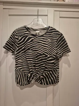 Top corto con estampado de cebra. Tiene un nudo en la parte delantera. Cuello redondo. - Manga corta. - Diseño llamativo. - Tela 100% algodón. - Medidas: Largo cuerpo 47cm. Largo mamga 17cm.