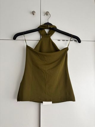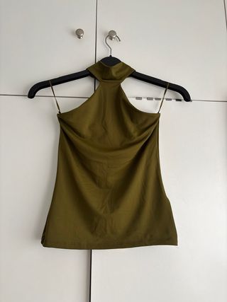 Top de estilo halter en color verde oliva. Diseño moderno y elegante. - Cuello alto. - Espalda descubierta.