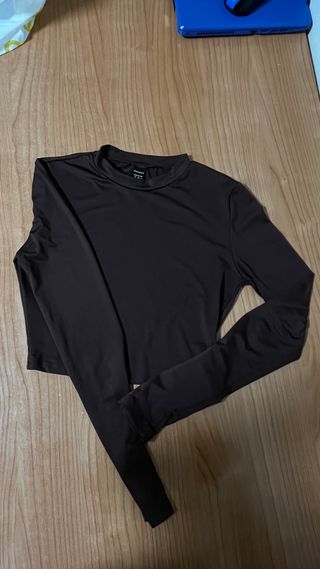 Top de manga larga en color marrón. Un básico versátil para cualquier ocasión. - Diseño de cuello redondo. - Mangas largas ajustadas. - Corte cropped.