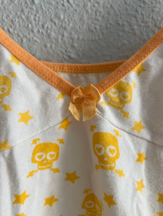 Top estilo lencero vintage de los años 2000. Tiene estampado de piratas. Es elástico y poco ceñido. Yo uso una S y me queda bien aunque no ajustado, calculo que será una talla M si quieres que te quede ceñido. Es antiguo aunque no lo he usado prácticamente. En el escote tiene un pequeño lazo y se ajusta al pecho