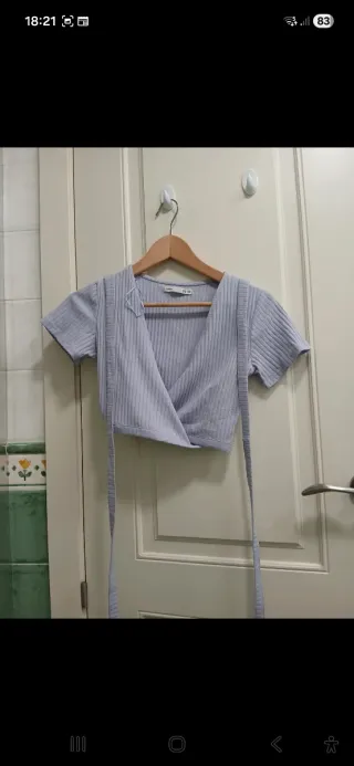 Top corto con un diseño a rayas verticales. Es una prenda ligera y cómoda. - Diseño de rayas verticales. - Escote elástico. - Mangas cortas abullonadas.