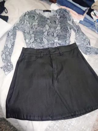 Conjunto de dos prendas de ropa. - Top de manga larga con estampado de serpiente. - Falda corta negra con detalle frontal.
