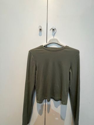 Crop top de manga larga con un diseño fruncido en el lateral. - Manga larga. - Diseño fruncido. Color aguamarina clarito, elástico y pegado, no lleva forro interior. En perfecto estado.