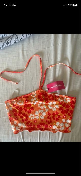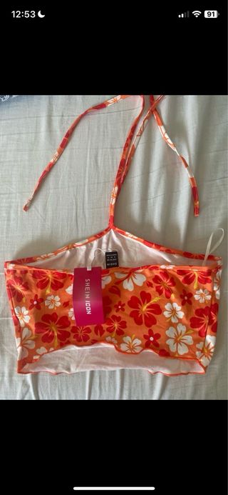 Top corto con estampado floral vibrante. se engancha del cuello