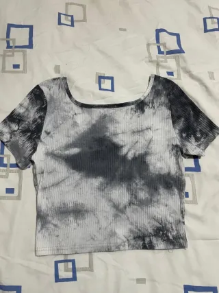 Top corto de tejido acanalado con un diseño tie-dye en tonos grises y blancos. Presenta un escote redondo y tres botones decorativos en la parte delantera. - Diseño tie-dye. - Tejido acanalado. - Escote redondo . - Cierre de botones.