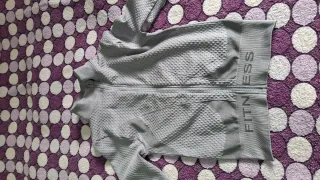 Conjunto deportivo de dos piezas, compuesto por un top y una chaqueta. - Diseño texturizado muy favorecedor en color gris. - Chaqueta con cremallera frontal. - Top con tirantes. - Banda elástica con texto 'FITNESS' en ambas prendas.