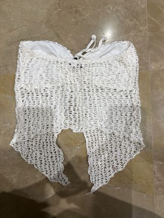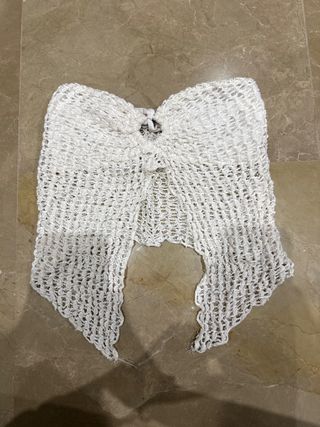 Top blanco de tejido con diseño anudado. - Diseño palabra de honor. - Tejido de red. - Detalle anudado en la parte frontal.