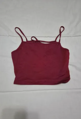 Crop top de tirantes finos y escote cuadrado. La espalda presenta un diseño cruzado con tiras. - Color burdeos. - Tirantes finos. - Espalda cruzada.