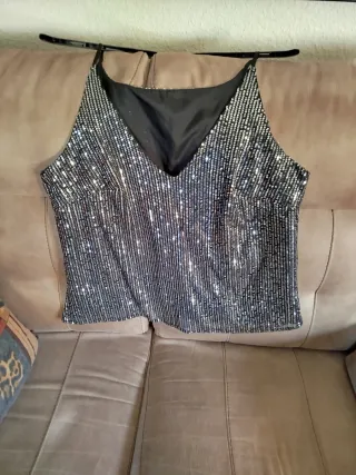 Top con un diseño brillante y elegante. - Detalle de lentejuelas plateadas. - Forro interior negro.