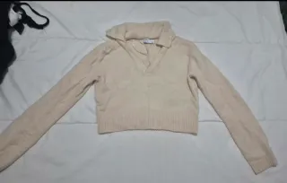 Jersey crop top de Bershka en color beige. Un básico versátil para tu armario. - Diseño de punto. - Cuello tipo polo. - Manga larga.