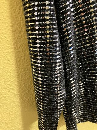 Top de fiesta con un diseño llamativo de lentejuelas plateadas sobre fondo negro. Ideal para eventos especiales. - Diseño asimétrico. - Manga larga en un lado. - Tejido brillante. pone XXL pero da más talla , sisa 58, largo 72