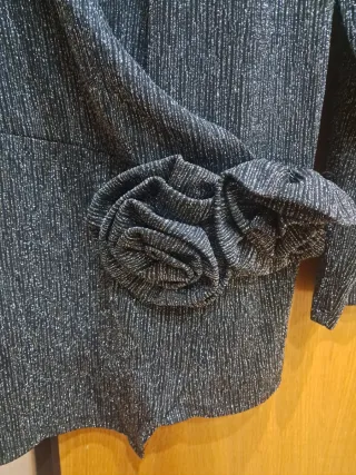 Elegante sueter con un diseño brillante y un detalle floral usado sólo 1 vez - Tejido con acabado metalizado. - Corte cruzado. - Adorno de flor.