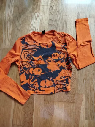 Top de manga larga con un llamativo estampado. - Diseño abstracto con rostros. - Corte crop.