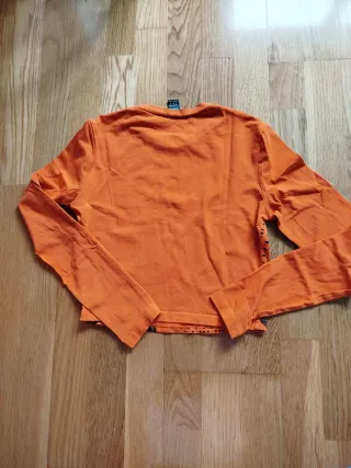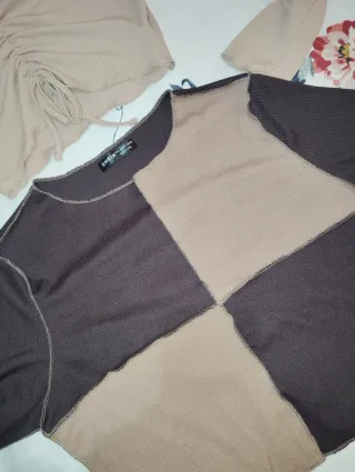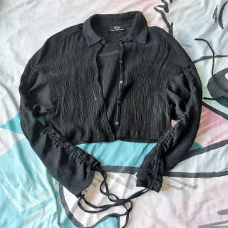 Top corto con textura y mangas largas. - Diseño fruncido en las mangas con cordones ajustables. - Cierre de botones en la parte delantera. - Cuello camisero. Yo lo he llegado a usar como chaqueta, también vale en talla S